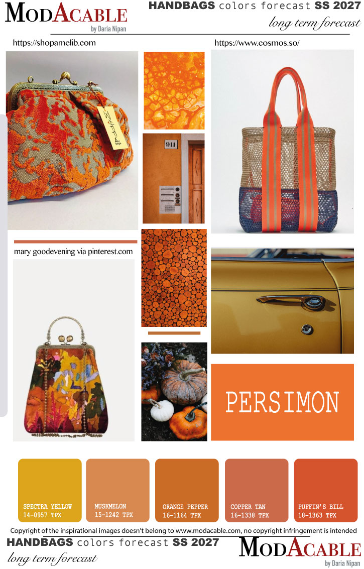 2026/27 ACCESSORIES TRENDSSS 2027 women’s handbags key color Persimon Posted on December 10, 2025December 15, 2025 by modacable For SS 2027, the Persimon handbag color trend features hot, sunny orange shades. Bright and vibrant tones energize accessories, enhancing fresh silhouettes. SS 2027 women’s handbags trend Punched SS 2027 handbags trend Beaded fringe