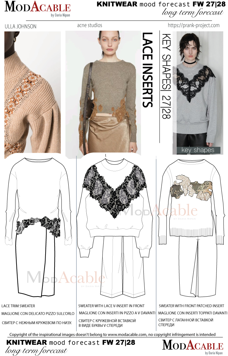 2027/28 KEY SHAPESFW 2027/28 knitwear shape Lace inserts Posted on April 1, 2026April 1, 2026 by modacable Knitwear trend featuring delicate lace inserts that add a feminine and elegant touch. FW 2027/28 knitwear mood Lace FW 2027/28 knitwear shape Pointelle