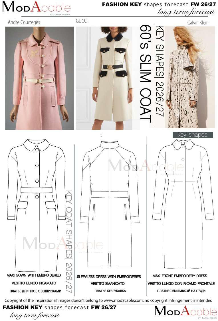AI 2026/27 – Previsione Silhouette Moda Donna: Il Ritorno del Cappotto Slim Anni ’70. Per l’autunno/inverno 2026/2027, le silhouette della moda donna si lasciano ispirare dal fascino senza tempo dei cappotti slim in stile anni ’70. Linee asciutte, tagli sartoriali e lunghezze medie o lunghe definiscono questa tendenza a lungo termine che unisce eleganza retrò e modernità. I cappotti diventano protagonisti del guardaroba stagionale, reinterpretati con tessuti contemporanei, dettagli ricercati e una palette cromatica sofisticata. Un trend che celebra la femminilità essenziale, la raffinatezza delle proporzioni e la riscoperta di un’eleganza sobria ma decisa.